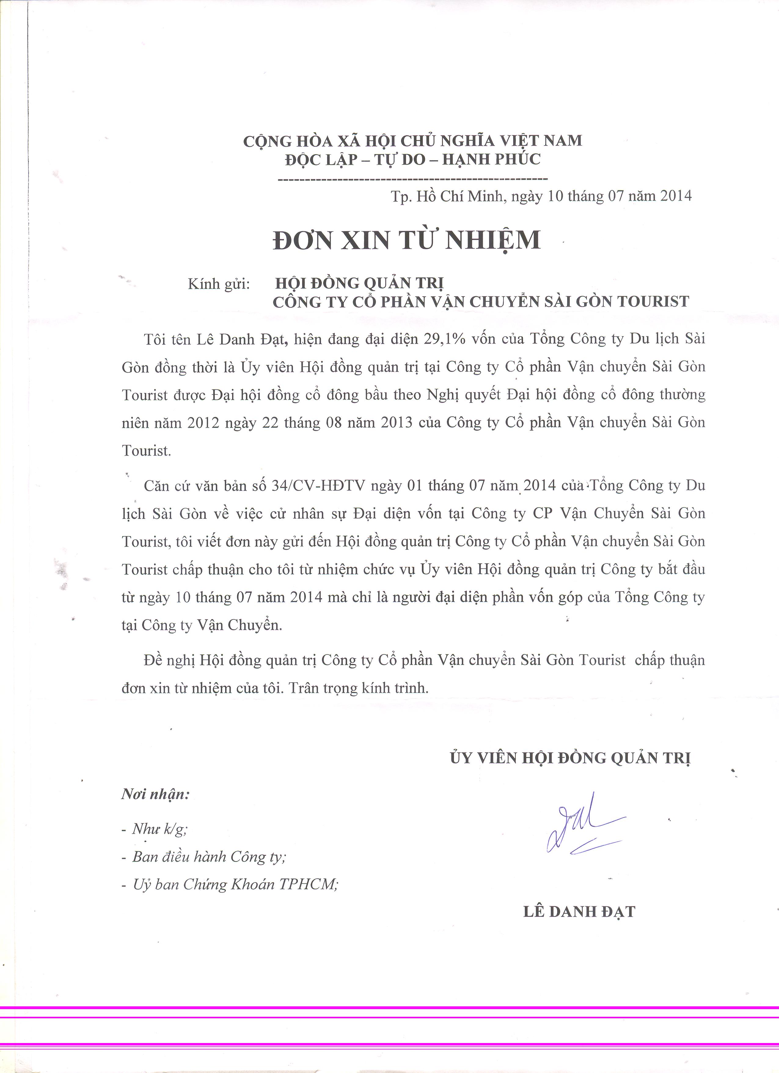 Ông Lê Danh Äạt - thà nh viên Há»™i đồng Quản trị công ty xin từ nhiệm và không còn là ngưá»i đại diện vốn cá»§a Tổng Công ty Du lịch Sà i Gòn TNHH Má»™t Thà nh Viên tại Công ty Cổ phần Váºn chuyển Sà i Gòn Tourist kể từ ngà y 15/07/2014.